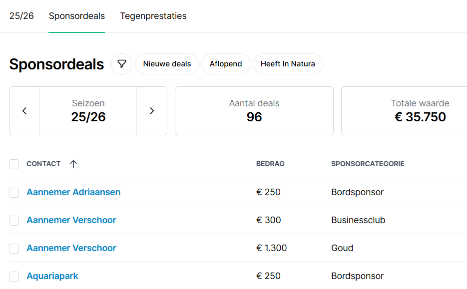 - Inzicht in de sponsorinkomsten per seizoen